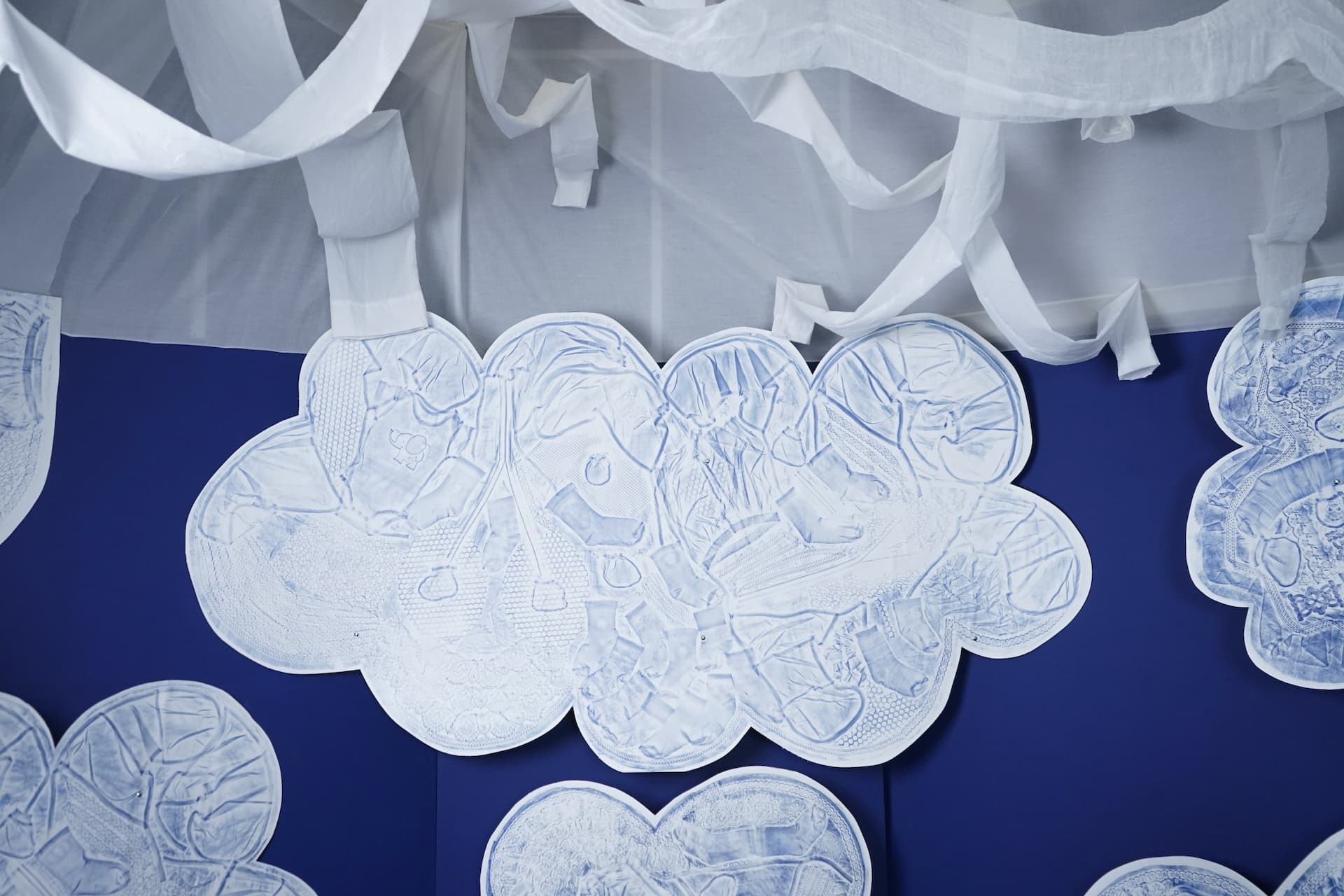 Kembara Biru (Traveling Blues) comes alive through interaction. Take a walk in clouds of possibilities and explore the boundless sky of imagination. You are invited to create artworks with the things that you find: paper, buttons, and gauze bandages. Express yourself and experiment with the art of carbon copy! Create as many copies as you like. You can take your art home or you can help complete the installation and exhibit your work in the Museum — just insert your creation into the pockets in the clouds!