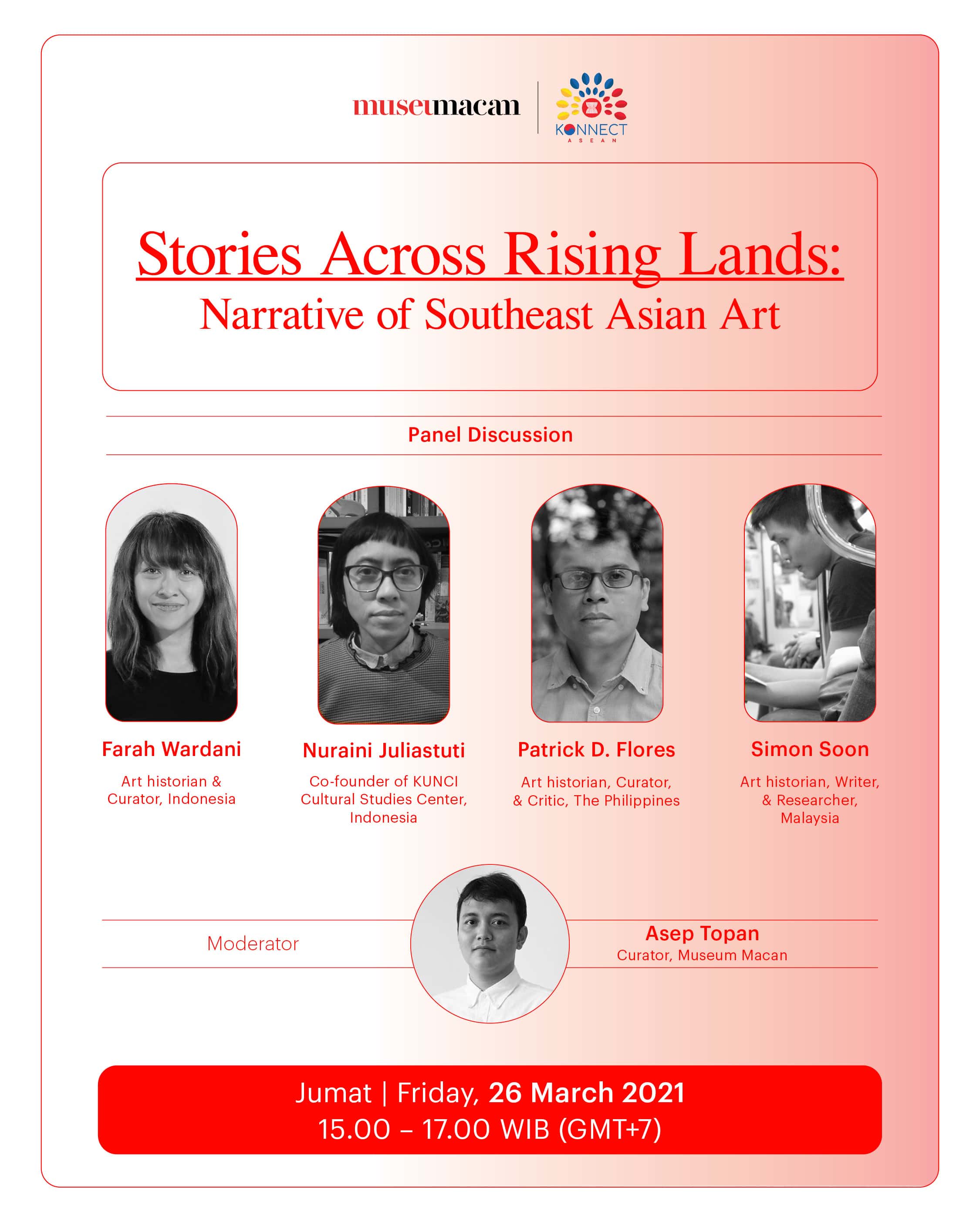 Mari berkumpul dan berdiskusi bersama para kurator, kritikus, dan sejarawan seni secara daring! Kita akan bersama-sama membahas tantangan dalam mengartikulasikan narasi seni rupa di Asia Tenggara secara lebih dalam.