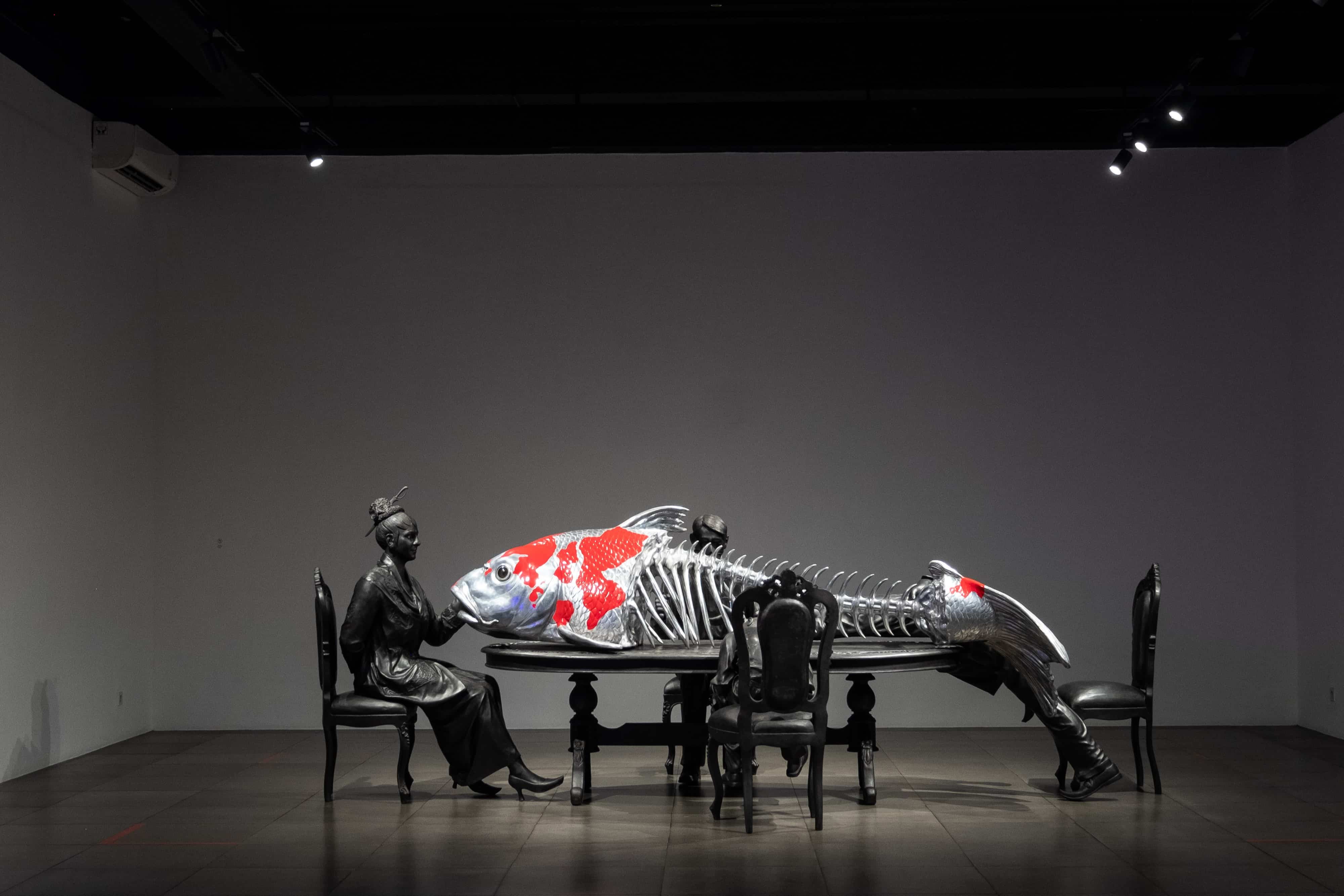 Entang Wiharso, Under Inheritance (2014–2015). Aluminium, grafit, resin, benang, cat otomotif, pigmen warn, masker industri. 150 x 400 x 200 cm. Dipamerkan di 'Double Horizon: a solo exhibition by Entang Wiharso' di Srisasanti Gallery, 2022.